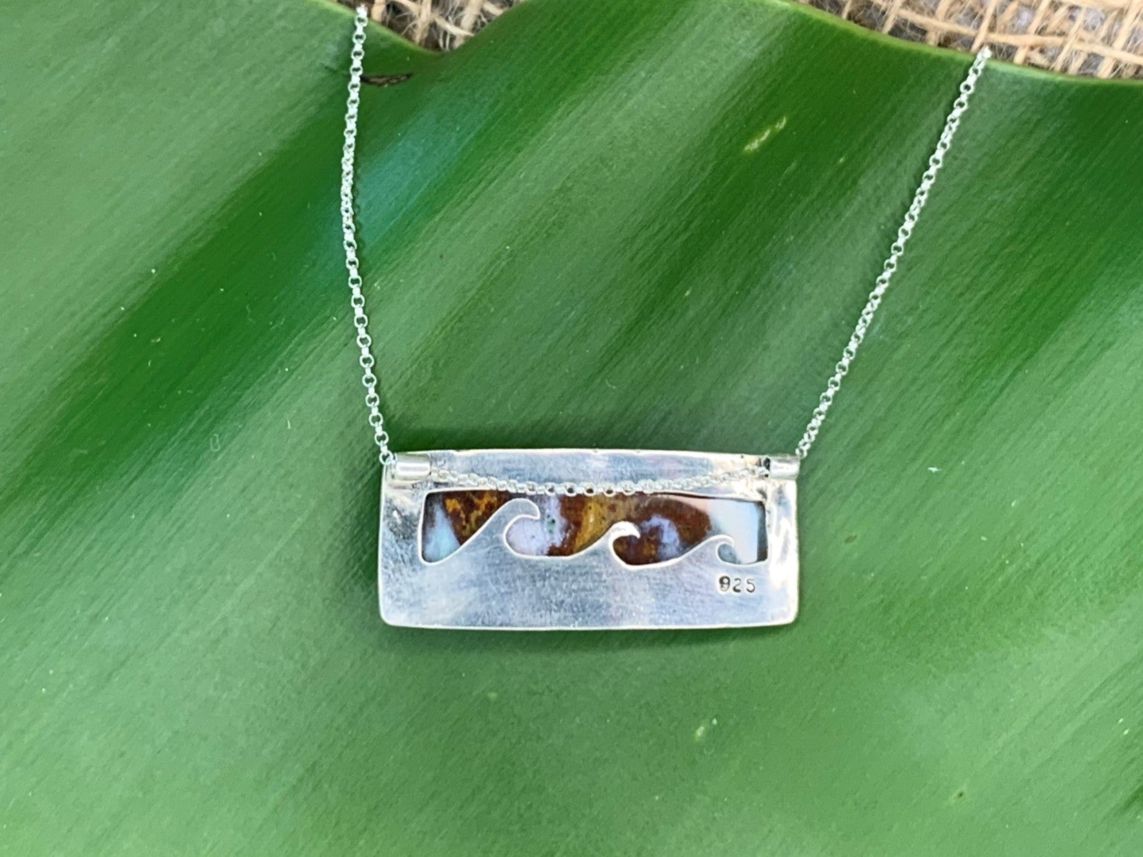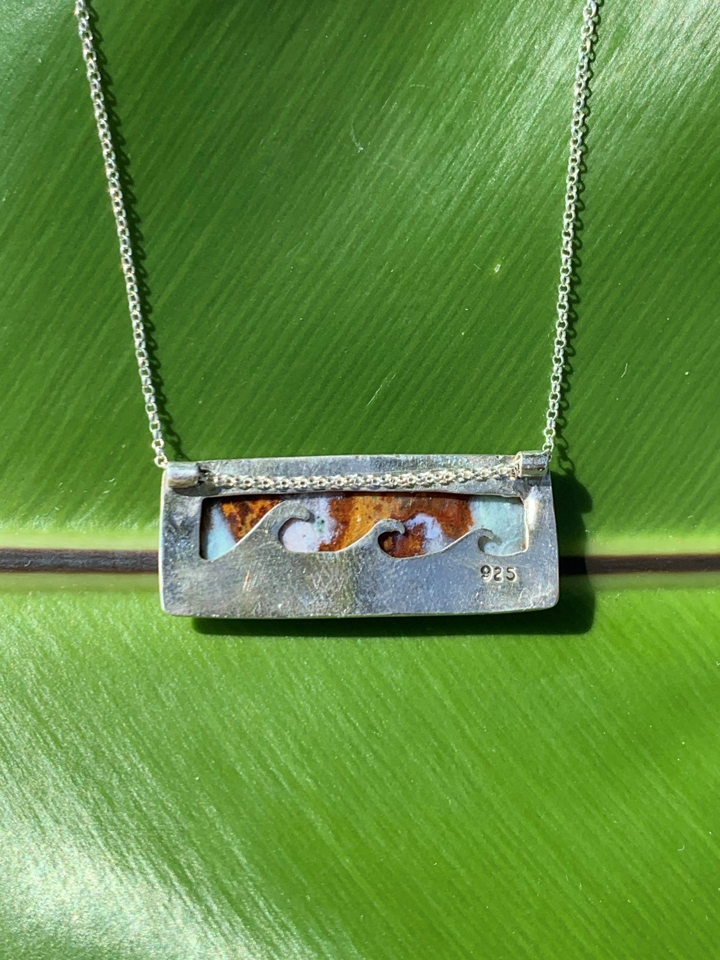 Indonesian petrified wood opal pendants with wave cut out on back plate