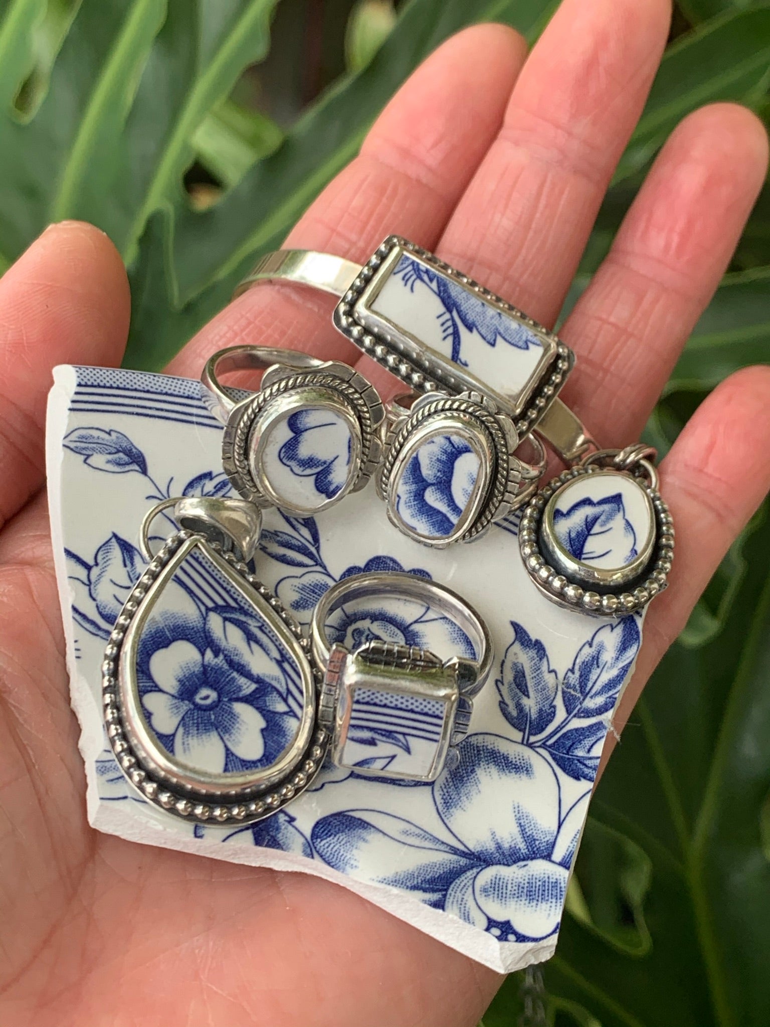 These English Tea Set Cabs are made from plates of the Clifton Collection by Spode. Cabs set in silver with beaded or twisted wire border.