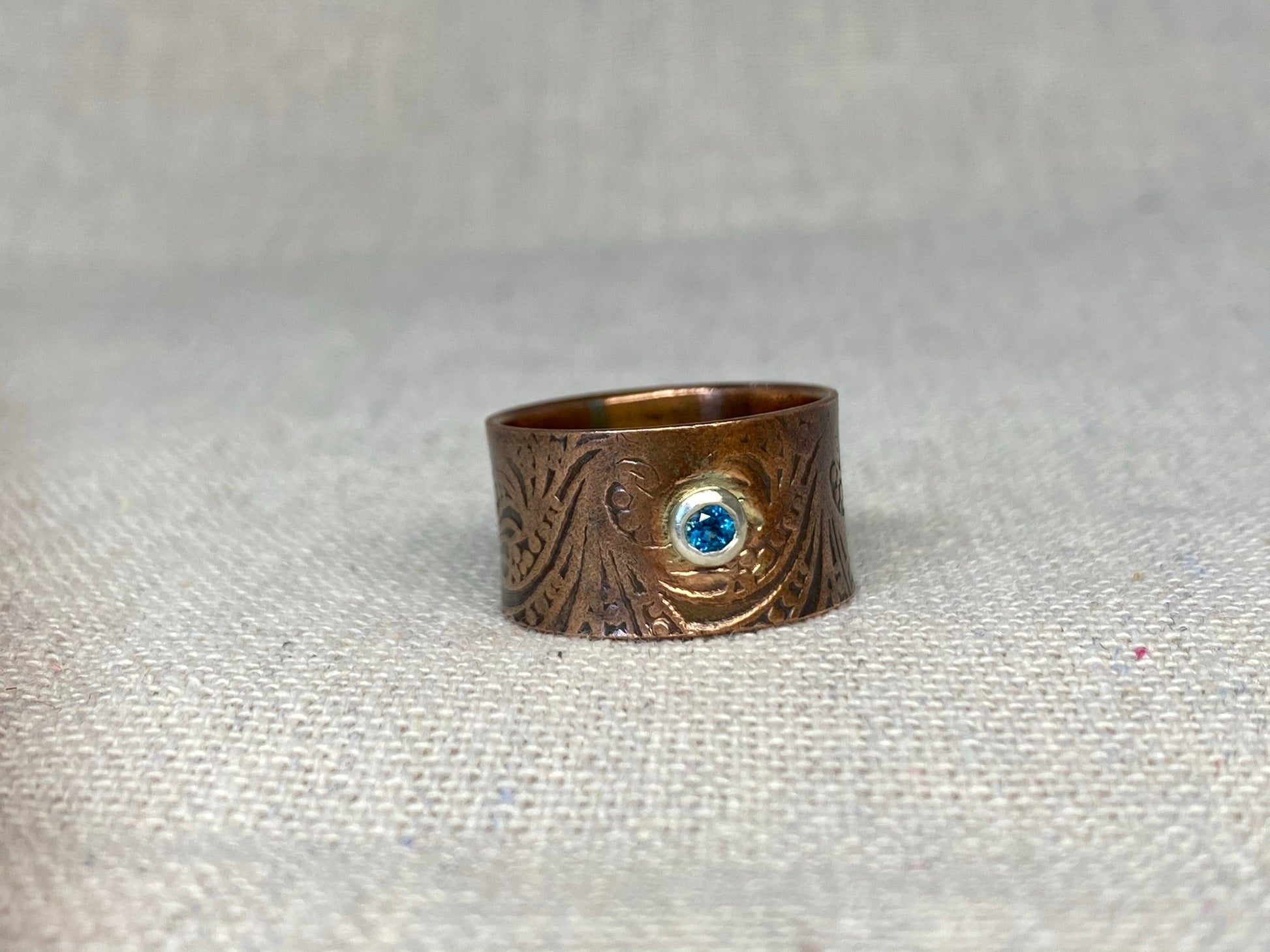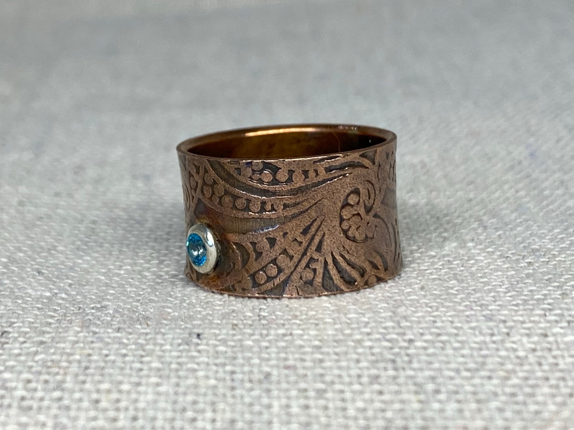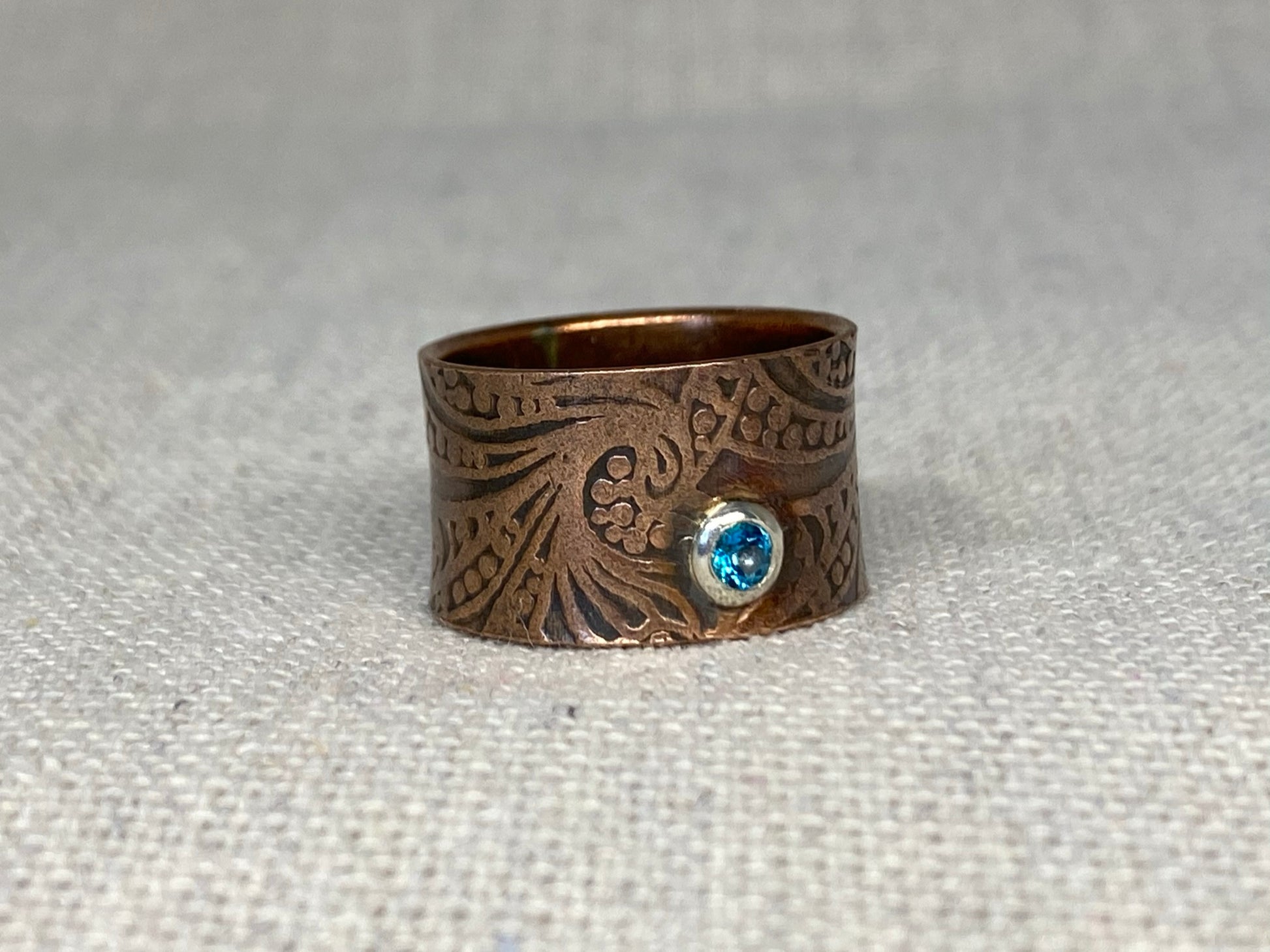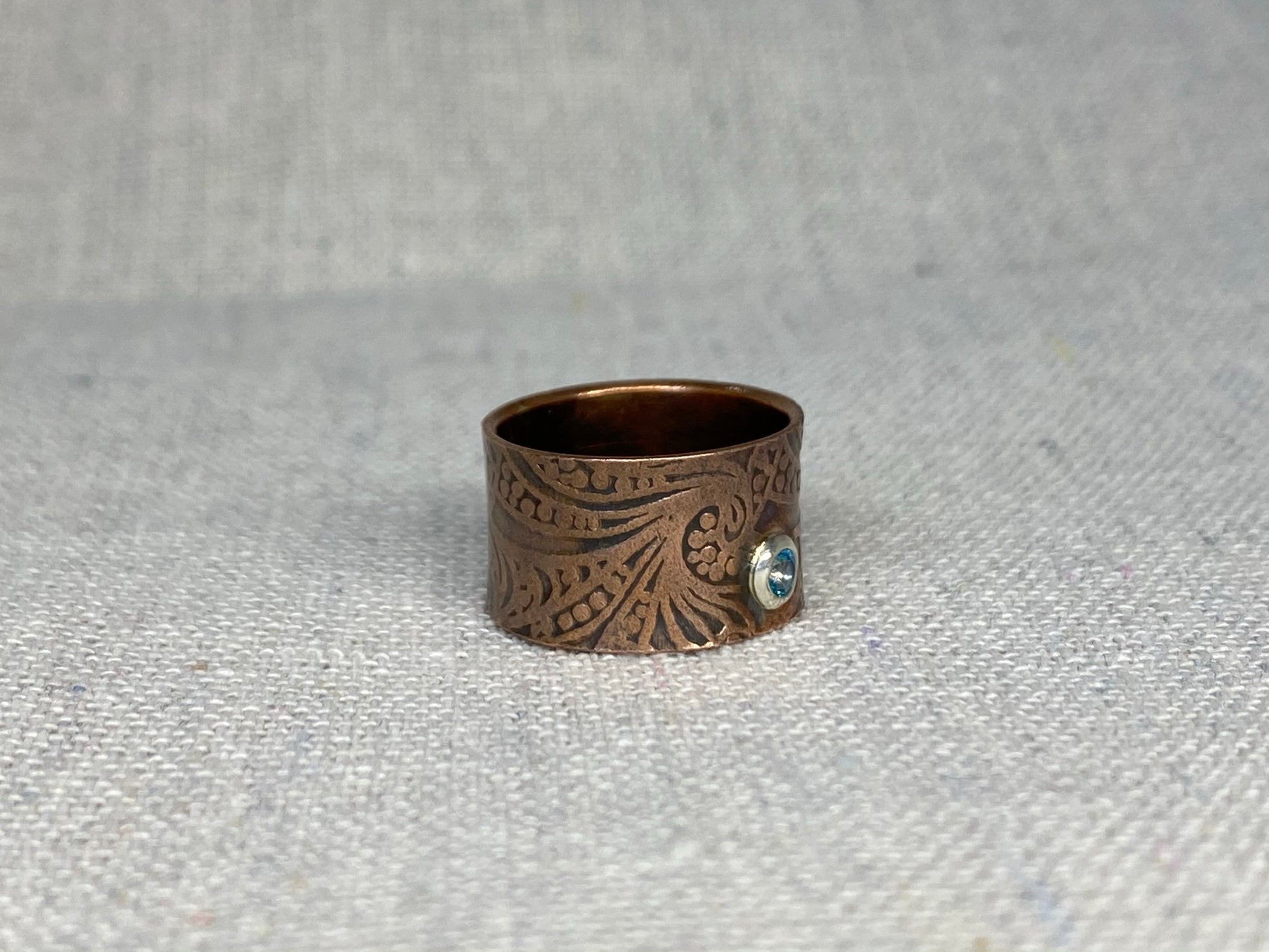 Wide copper band with hand stamped Breaker Waves design accented with a Swarovski Paraiba Blue Topaz gemstone.