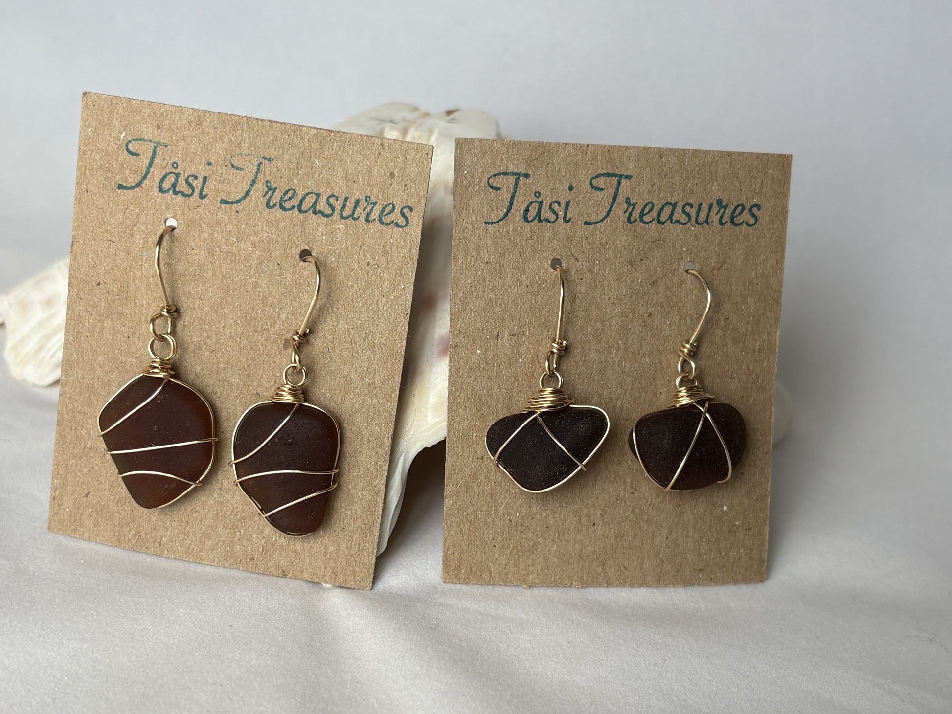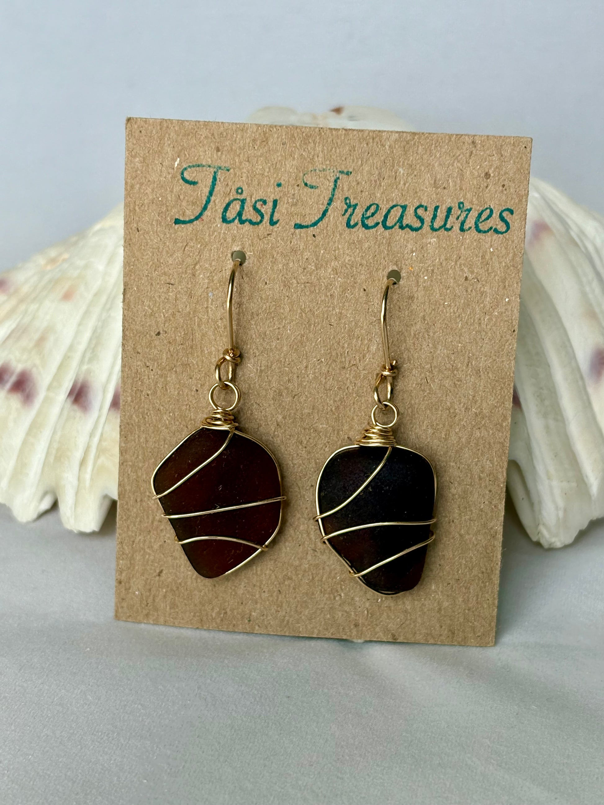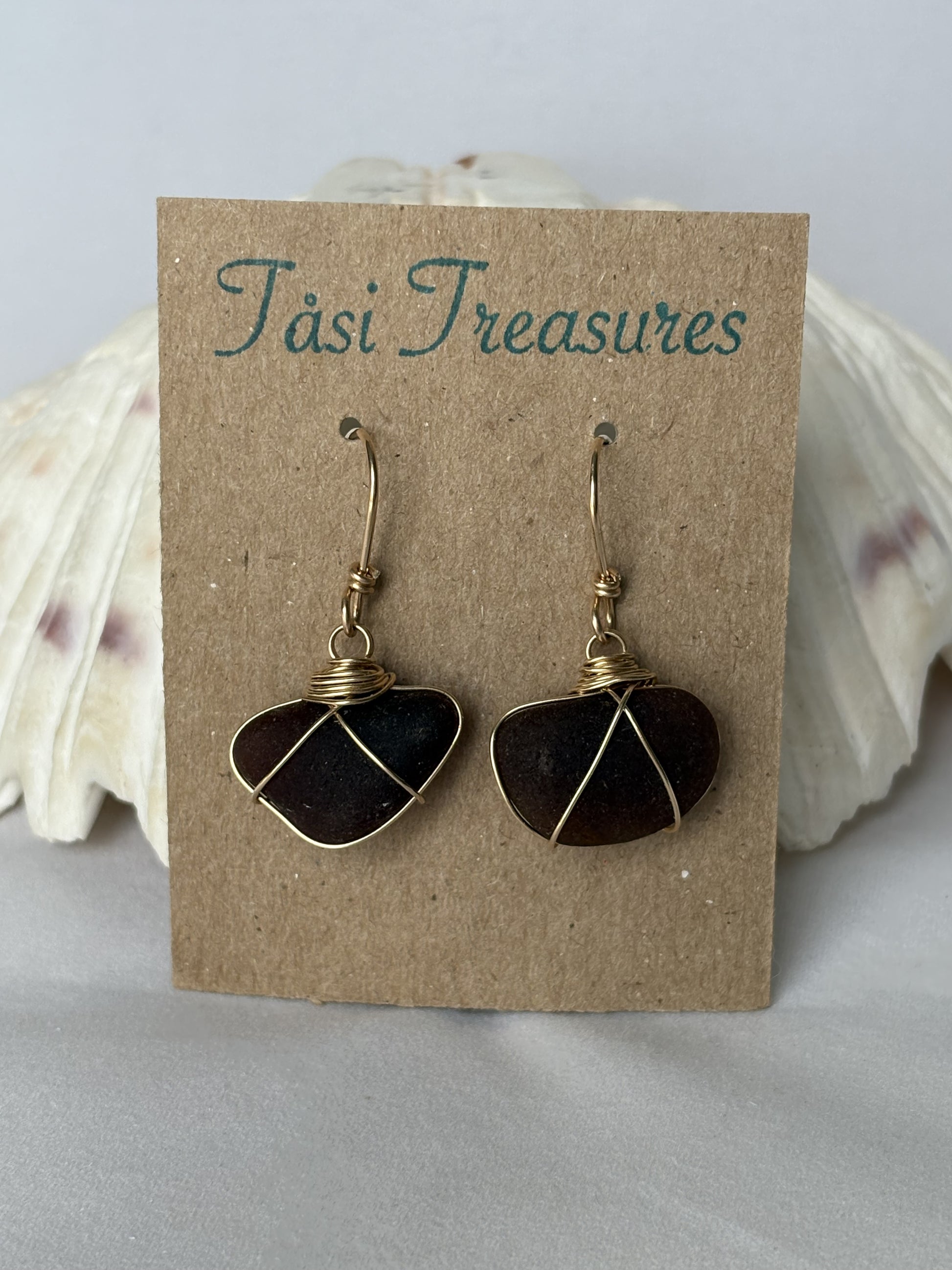 14 K Gold-filled wire wrapped brown sea glass earrings