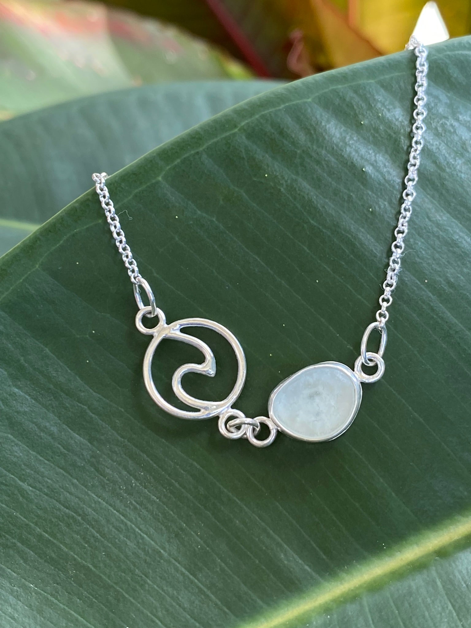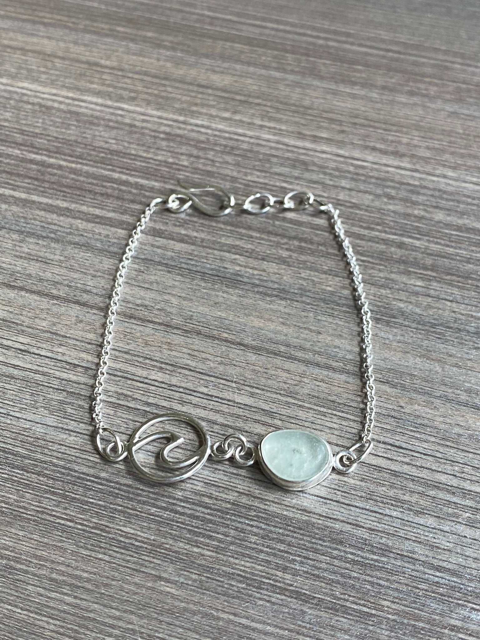 Round nåpu pendant with white seaglass. Anklet is secured with an S clasp and extender.