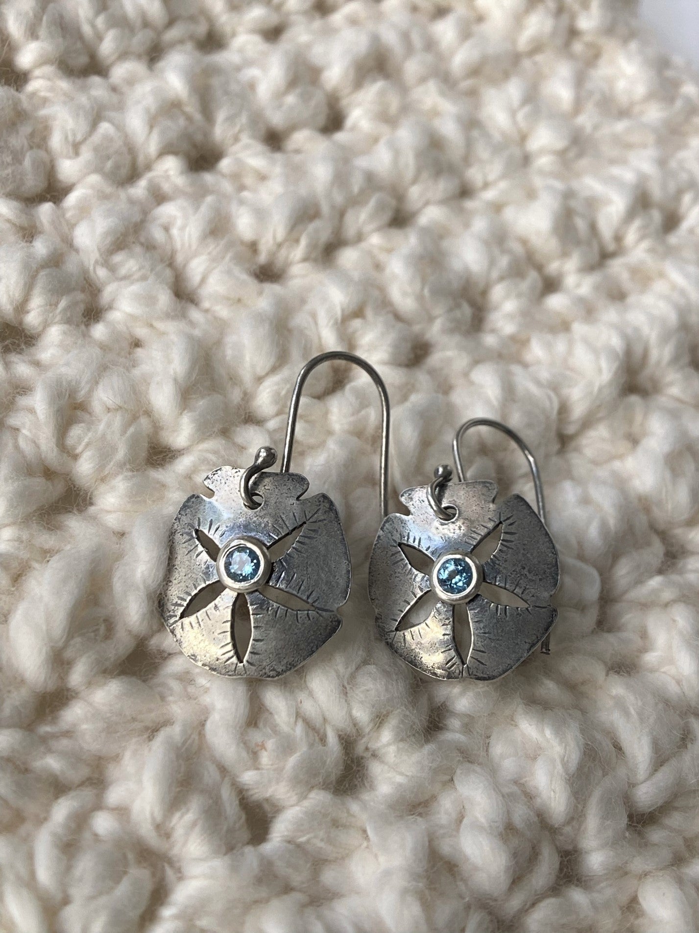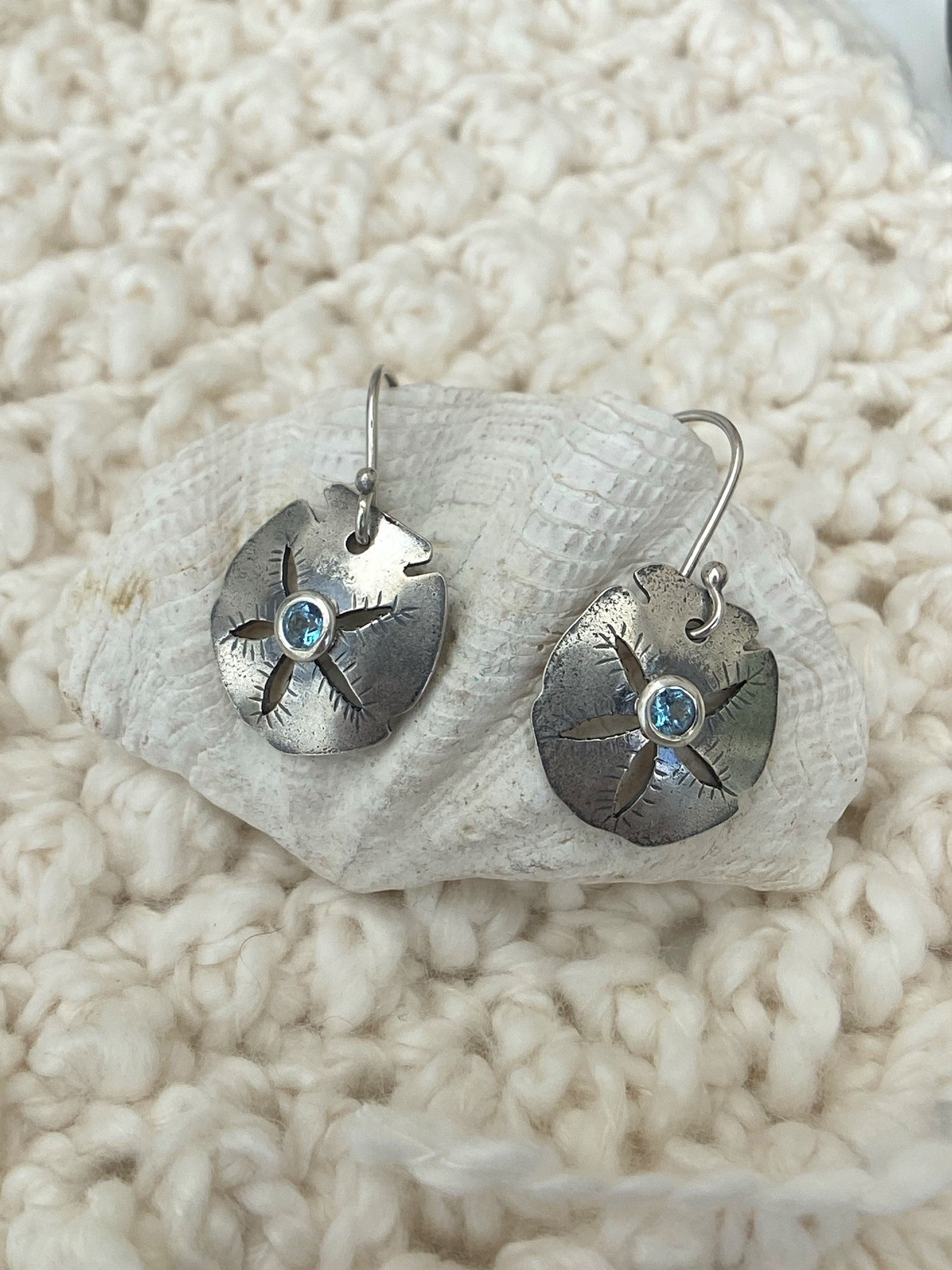 Hand-forged sand dollar earrings with Swarovski Ice Blue Topaz.