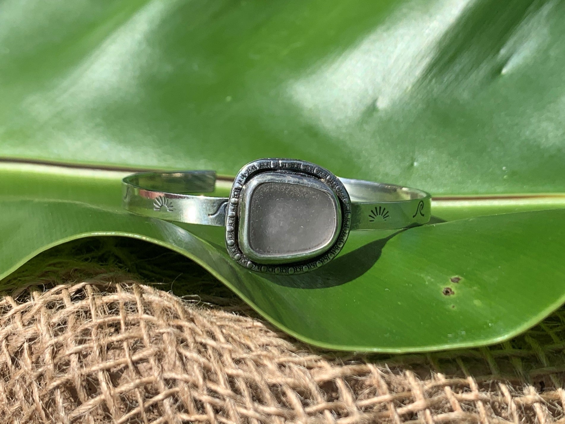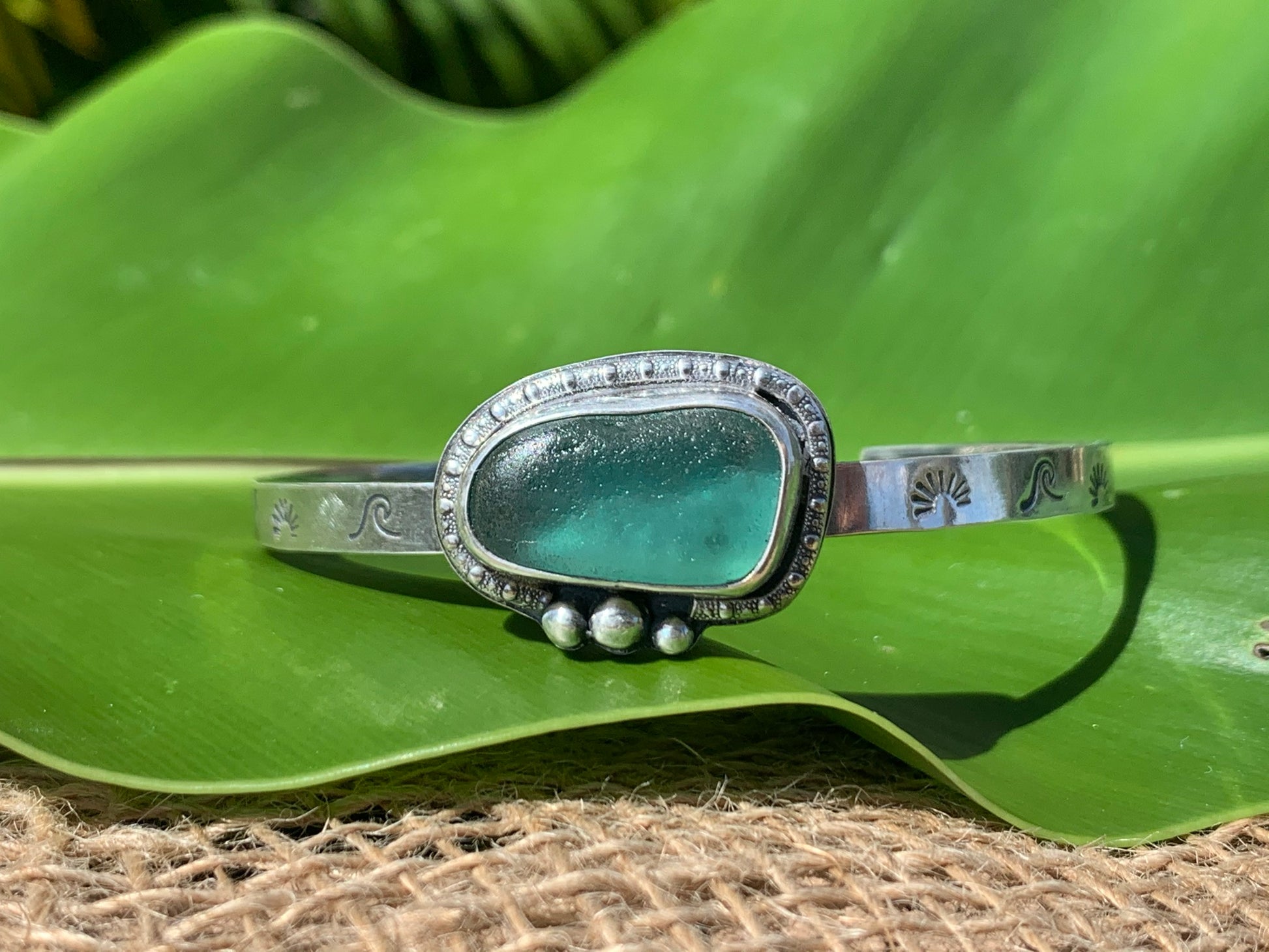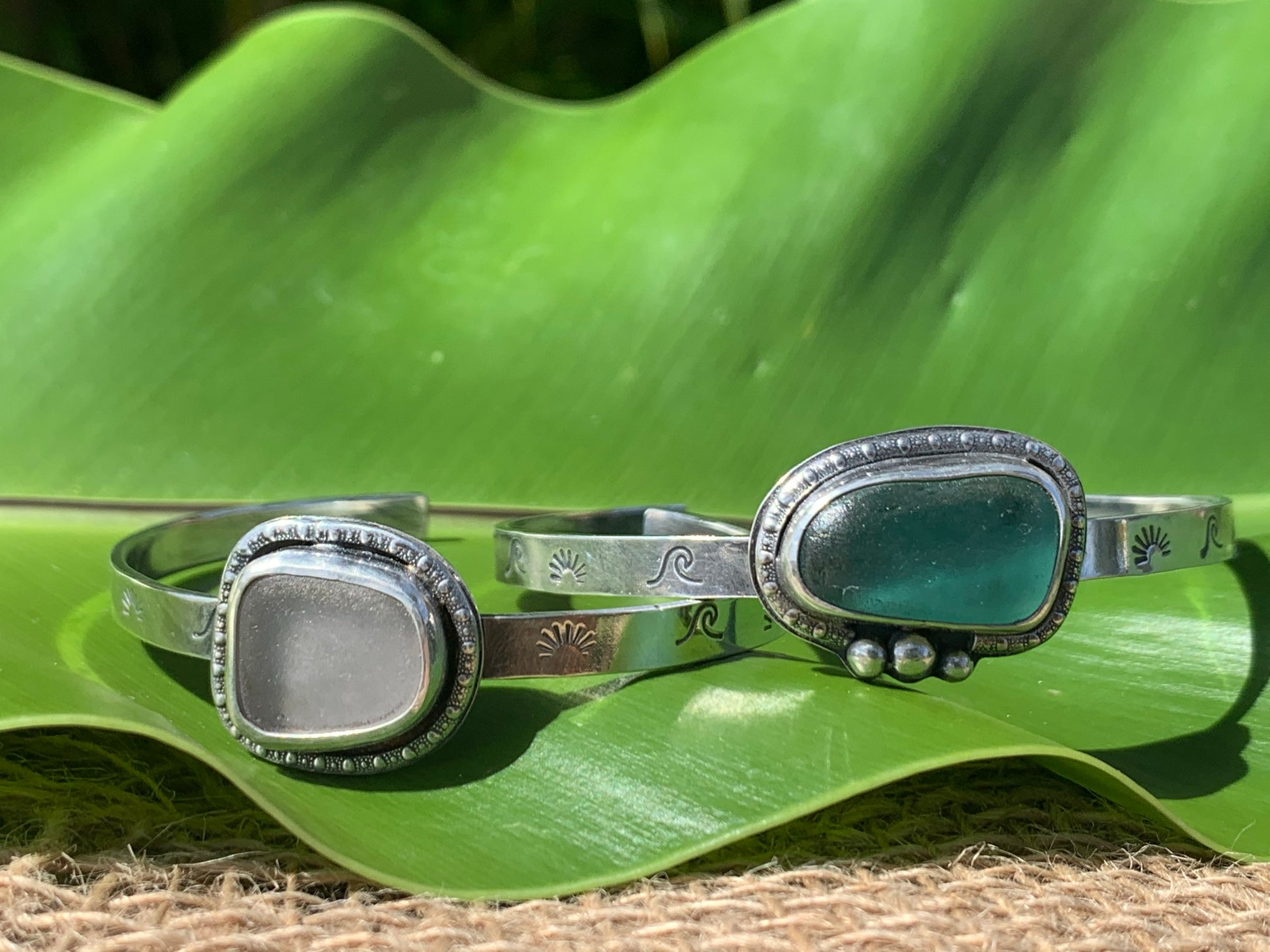 Sea Glass cuff bracelets with beaded wire border. Cuff stamped with waves and rising sun. Slightly adjustable/flexible cuff.