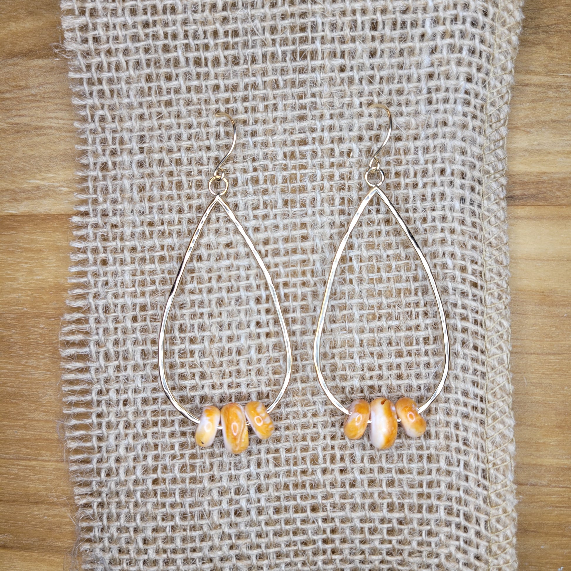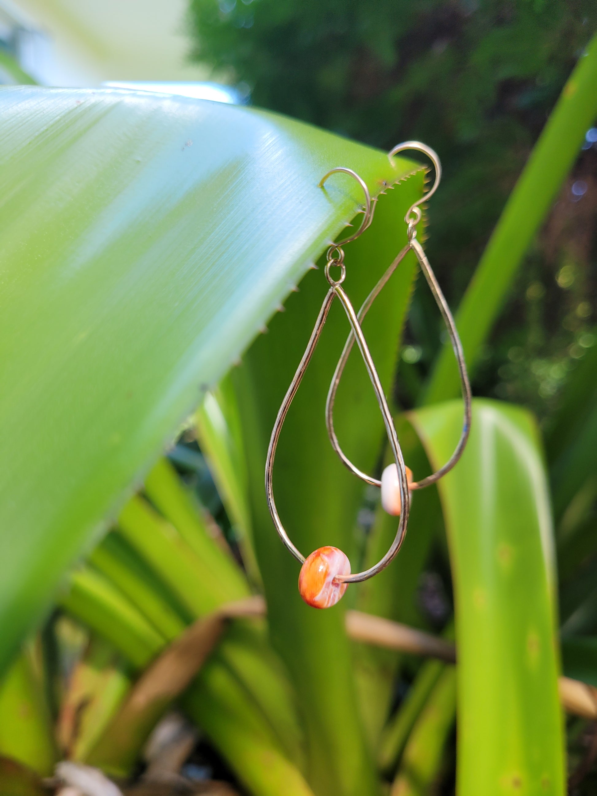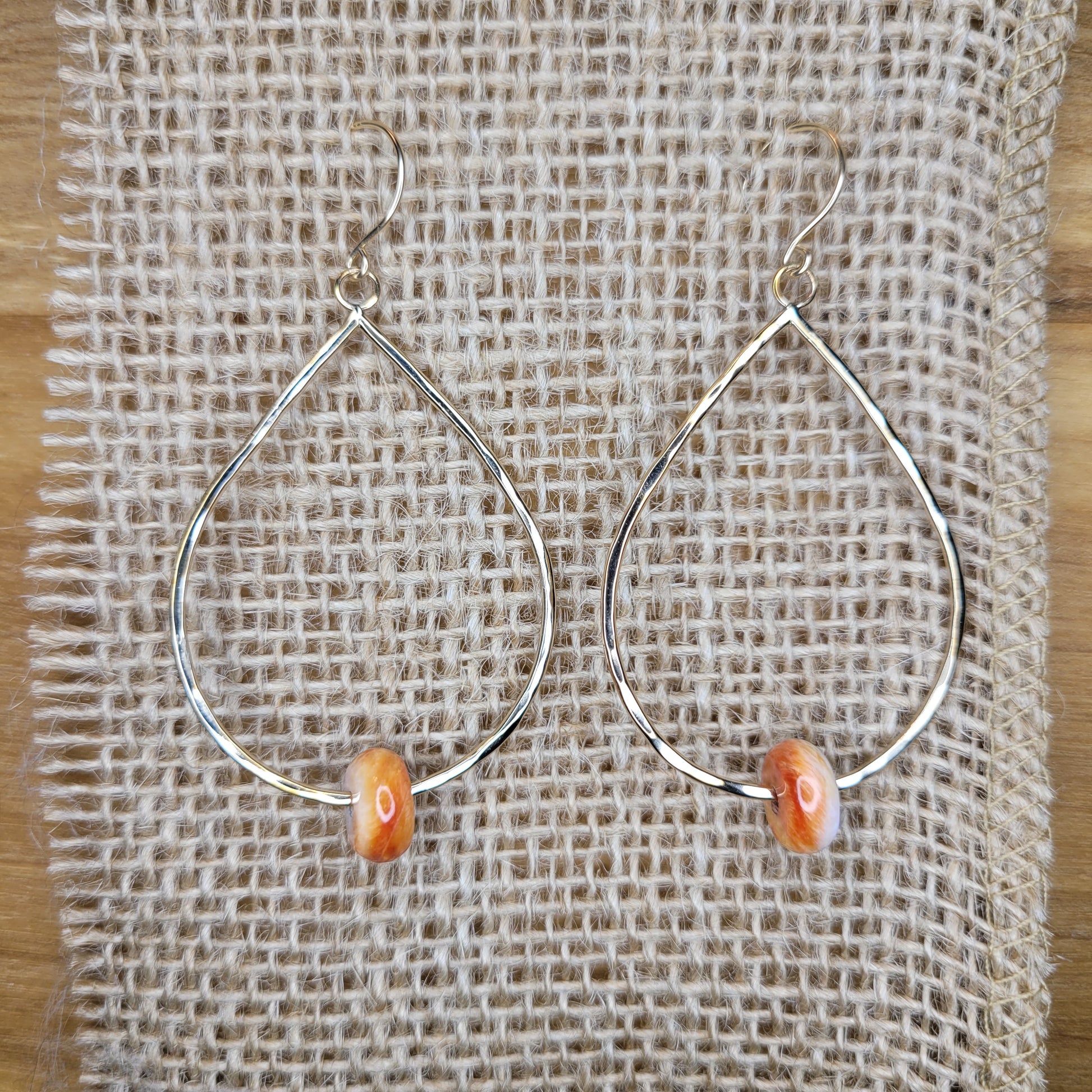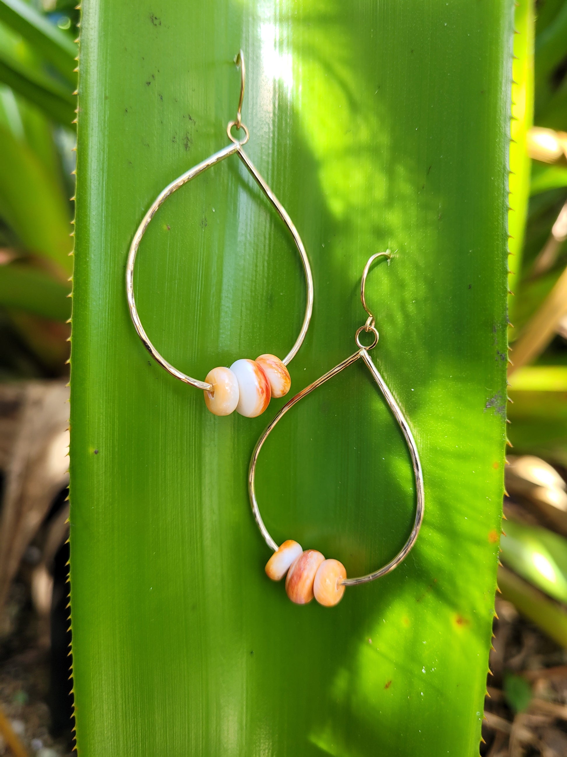 Spondylus rondelles set in a handmade large teardrop shaped dangle on hand made ear hooks.