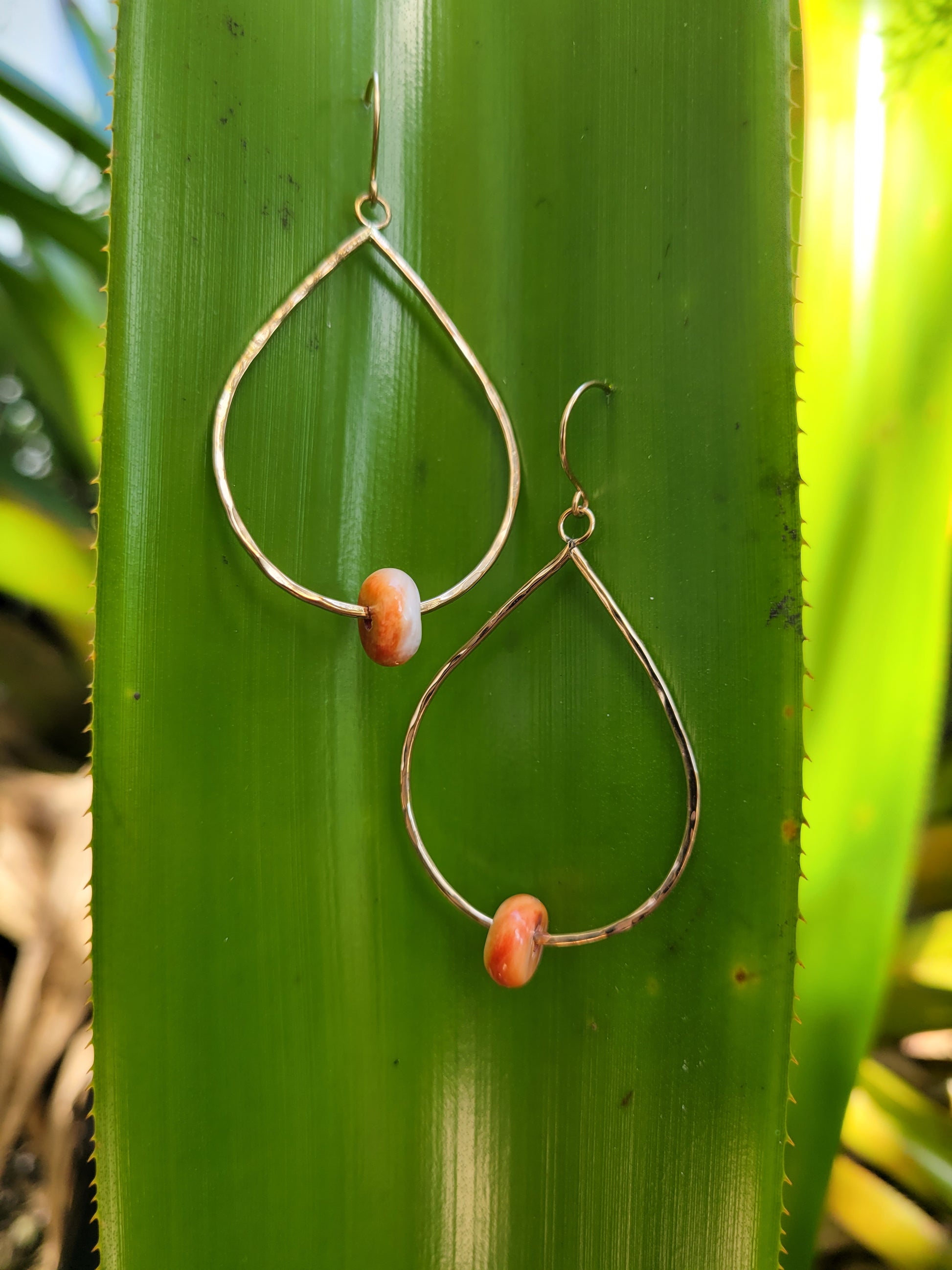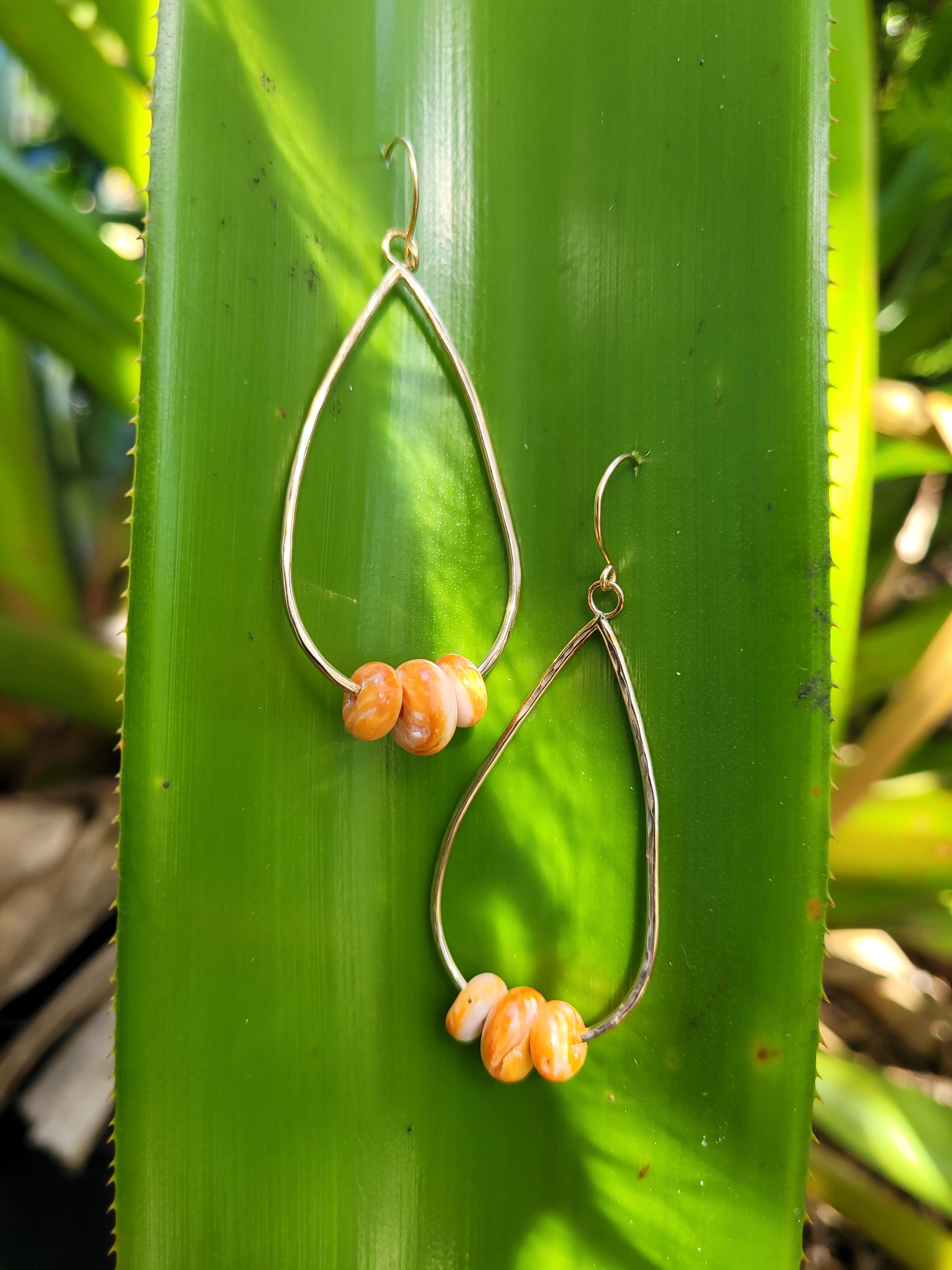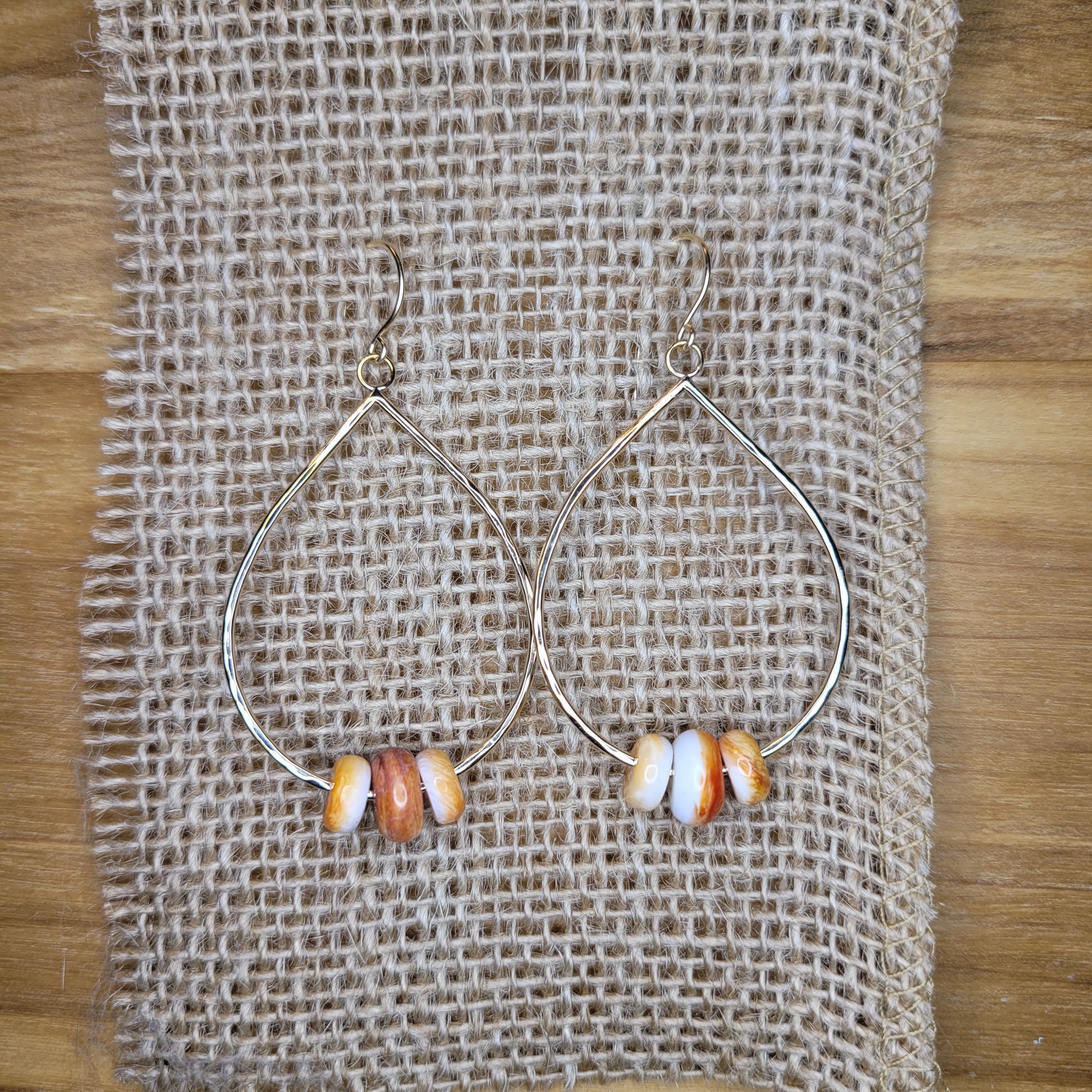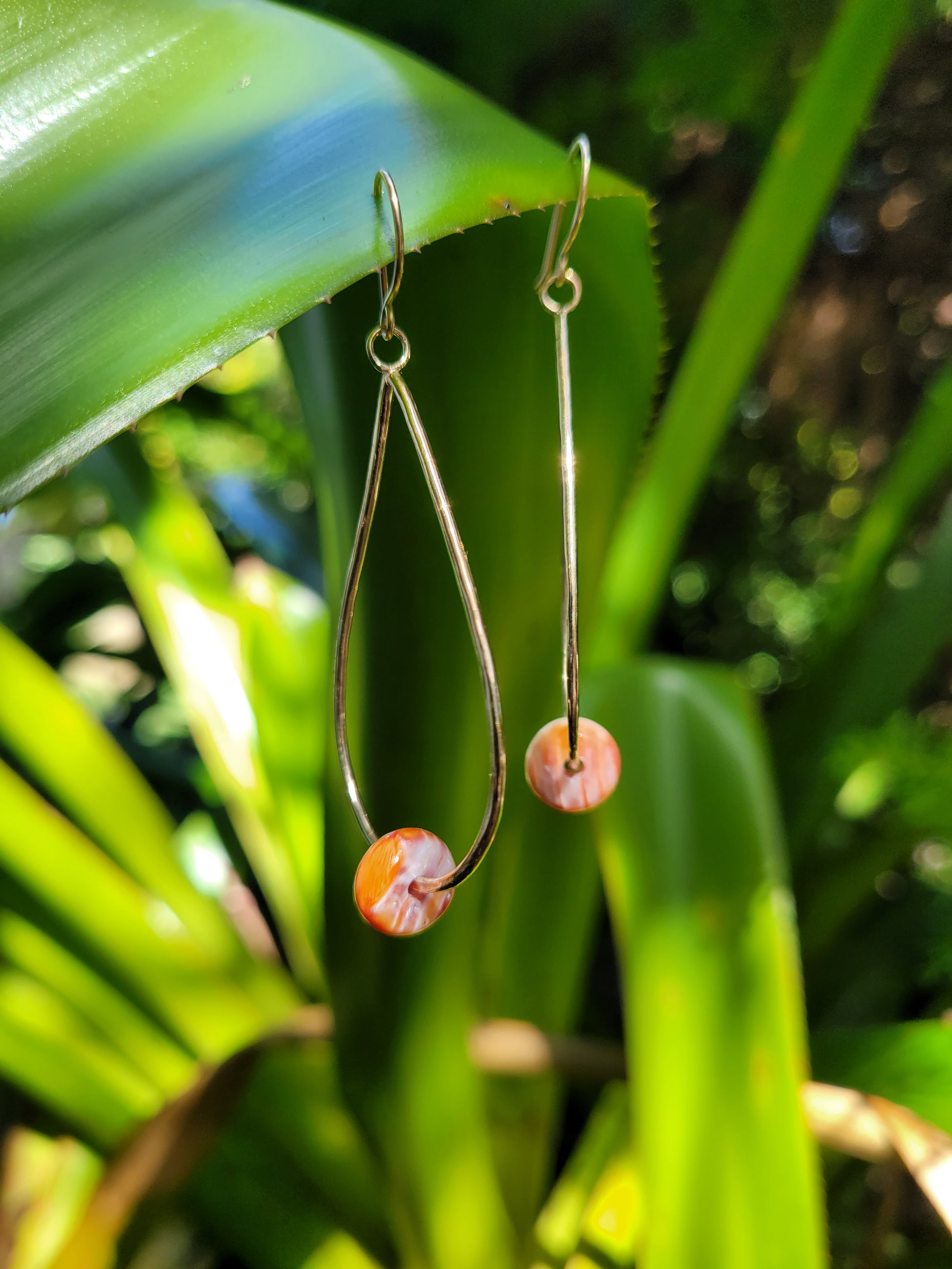 Spondylus rondelles set in a handmade large teardrop shaped dangle on hand made ear hooks.