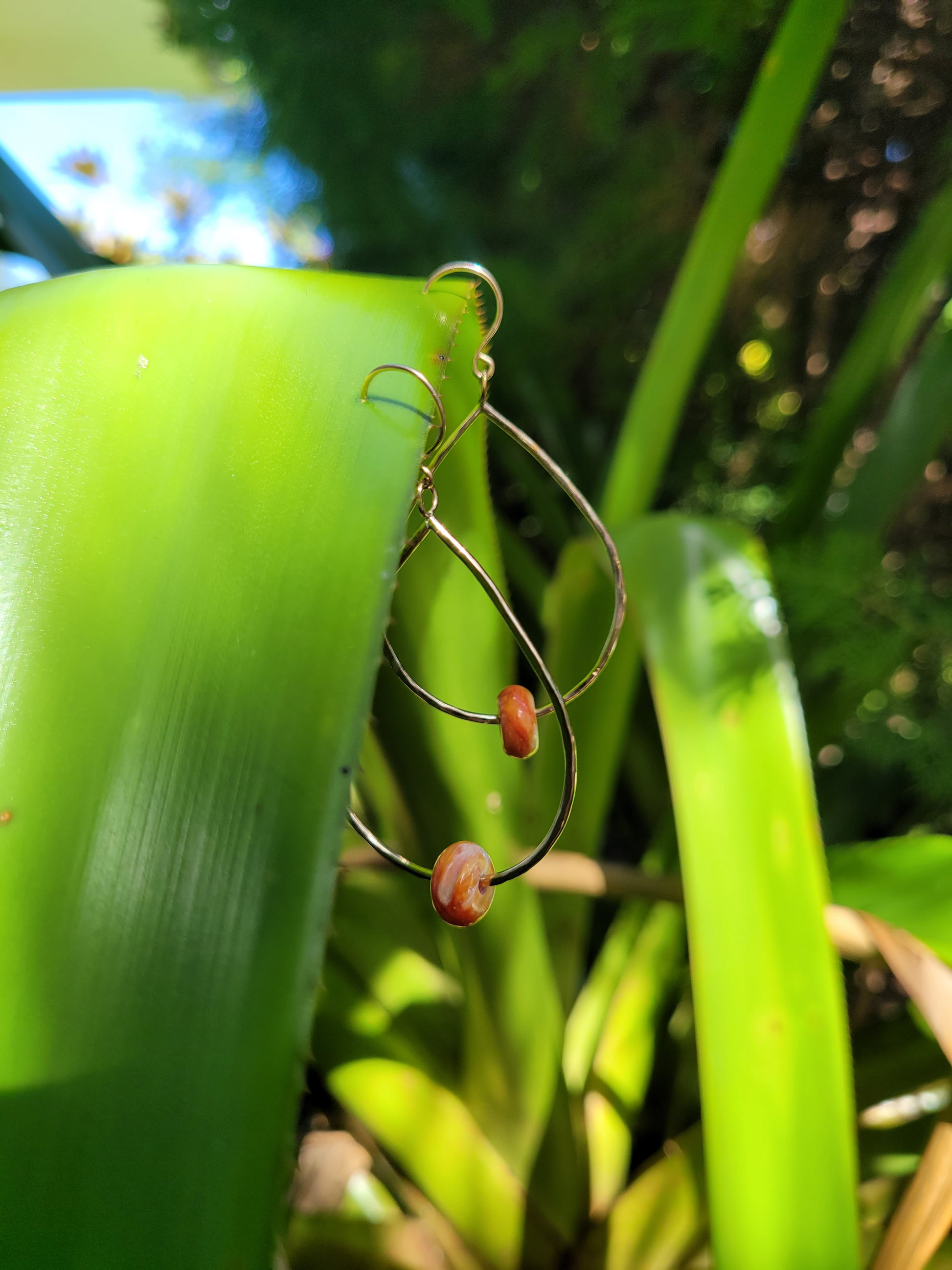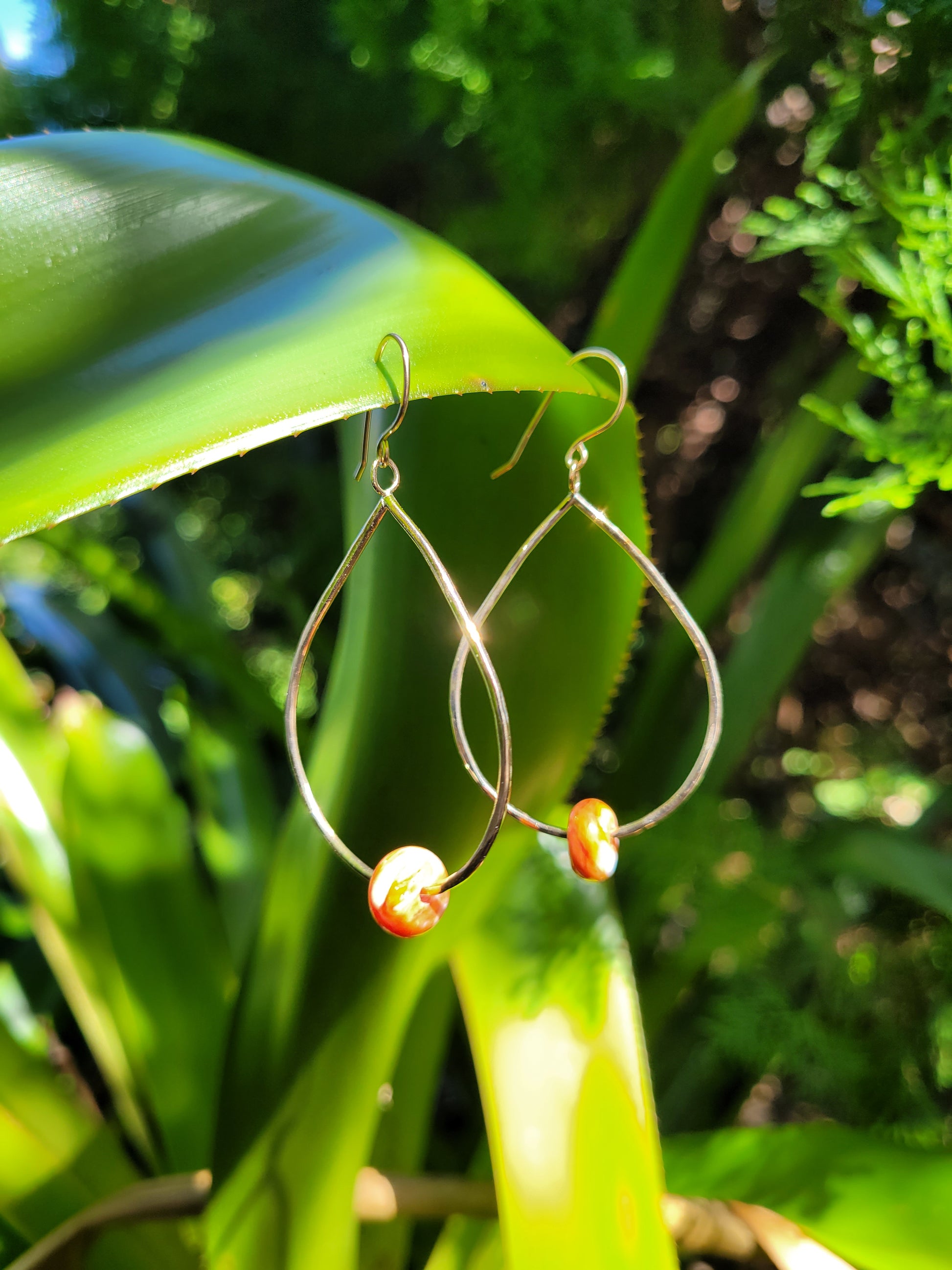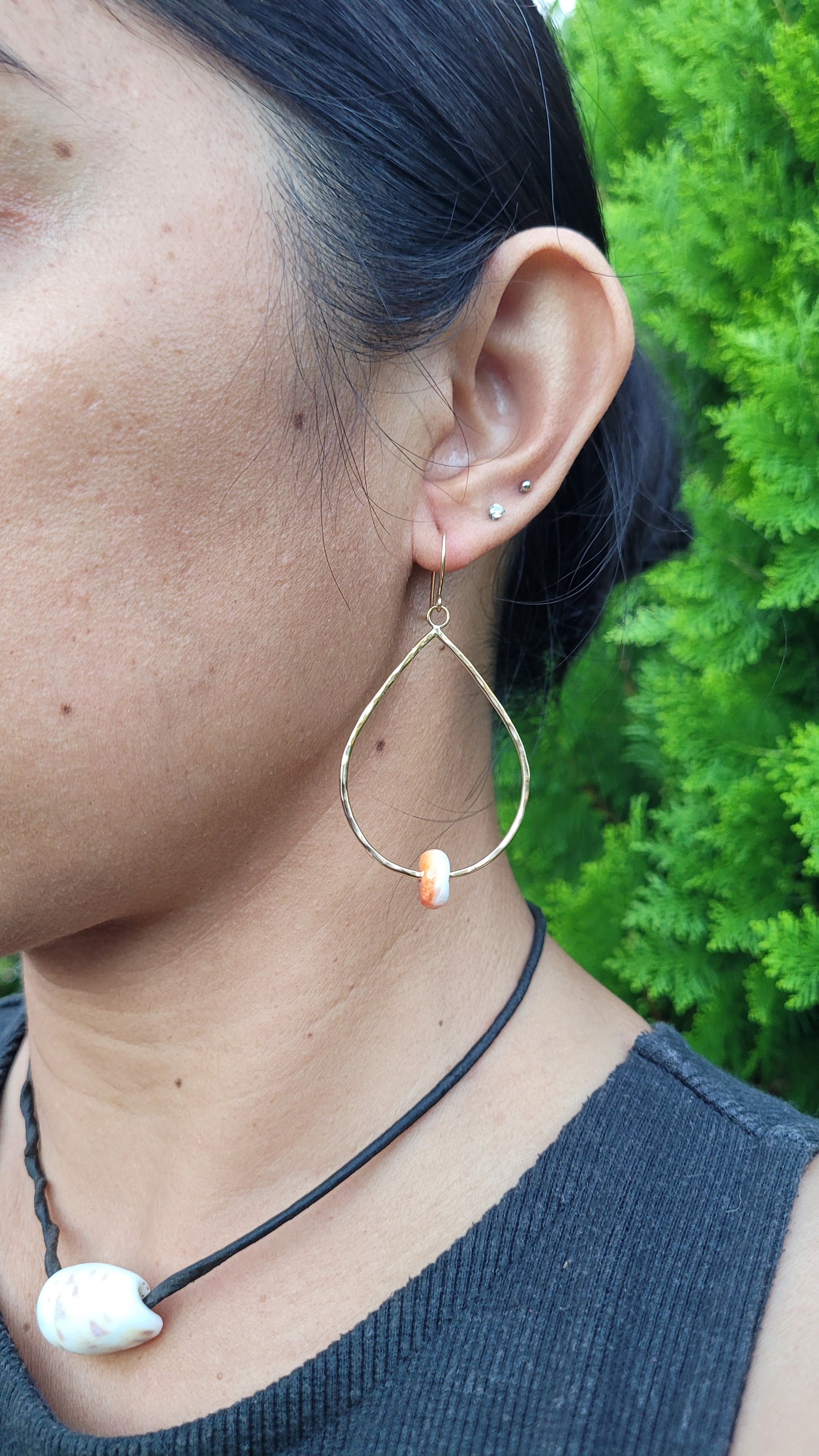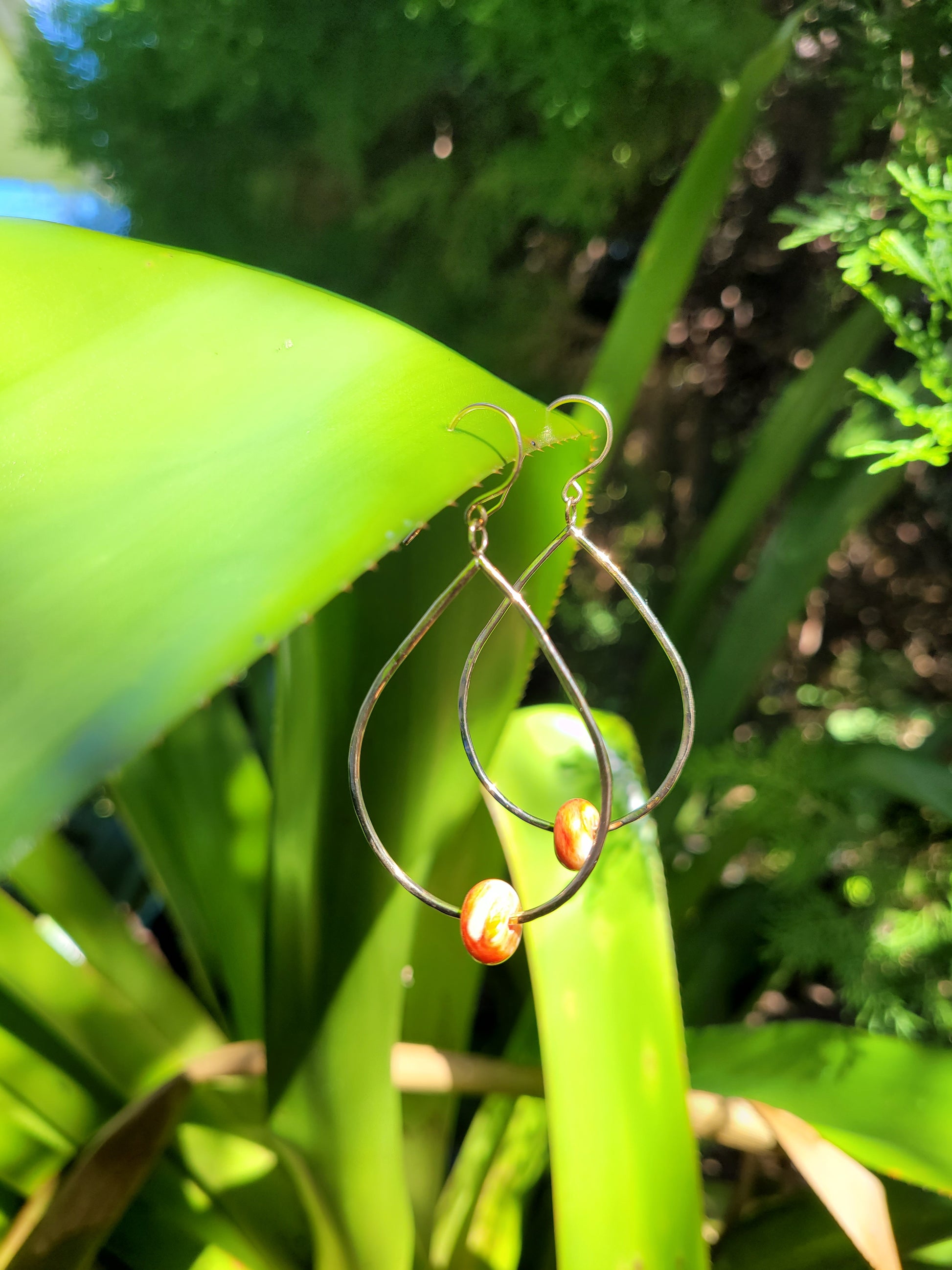 Spondylus rondelles set in a handmade large teardrop shaped dangle on hand made ear hooks.