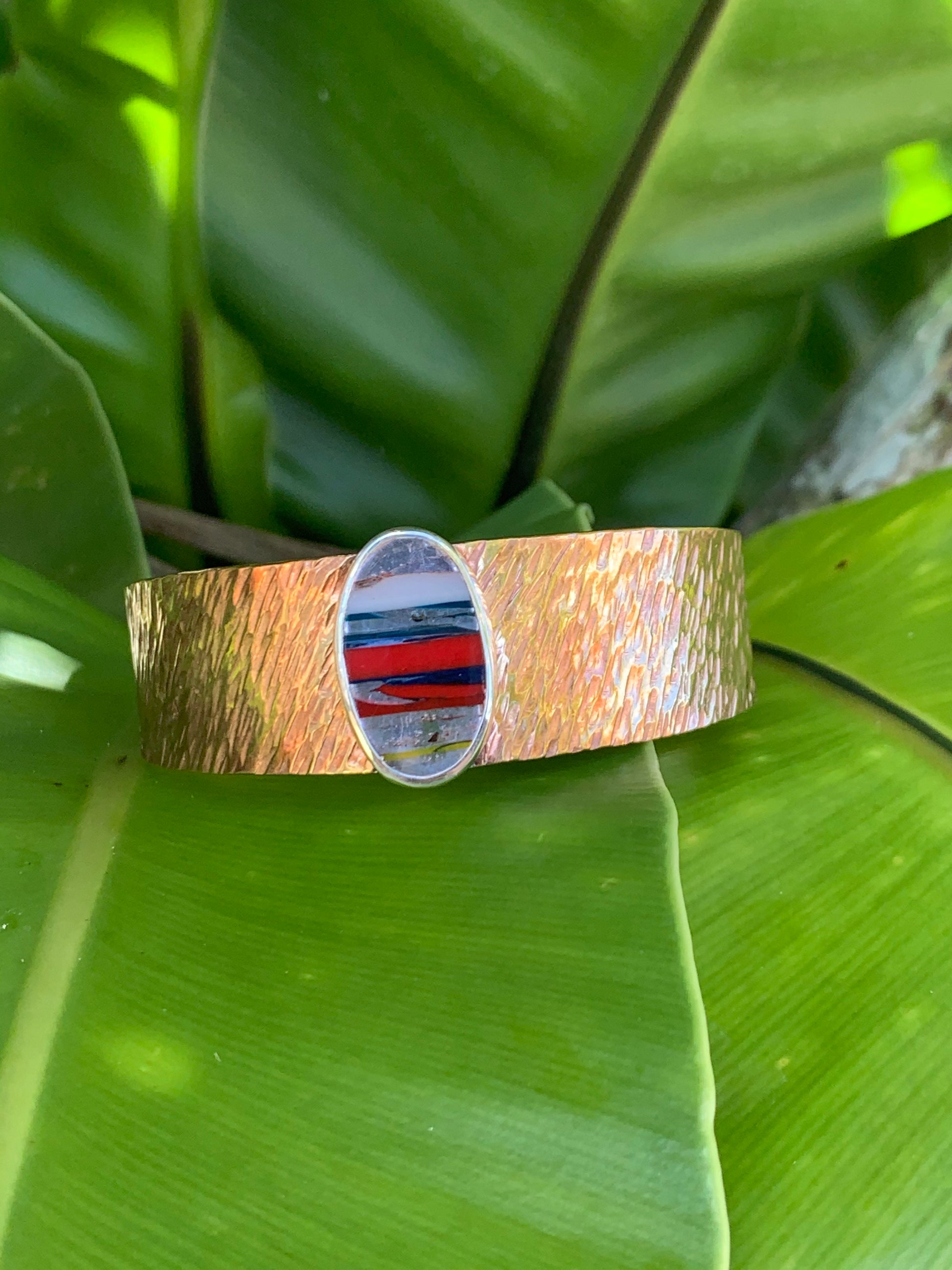 Textured brass cuff with oval Surfite cabochon set in silver. This Surfite cab was hand-cut and polished from repurpsed surfboard resin material.