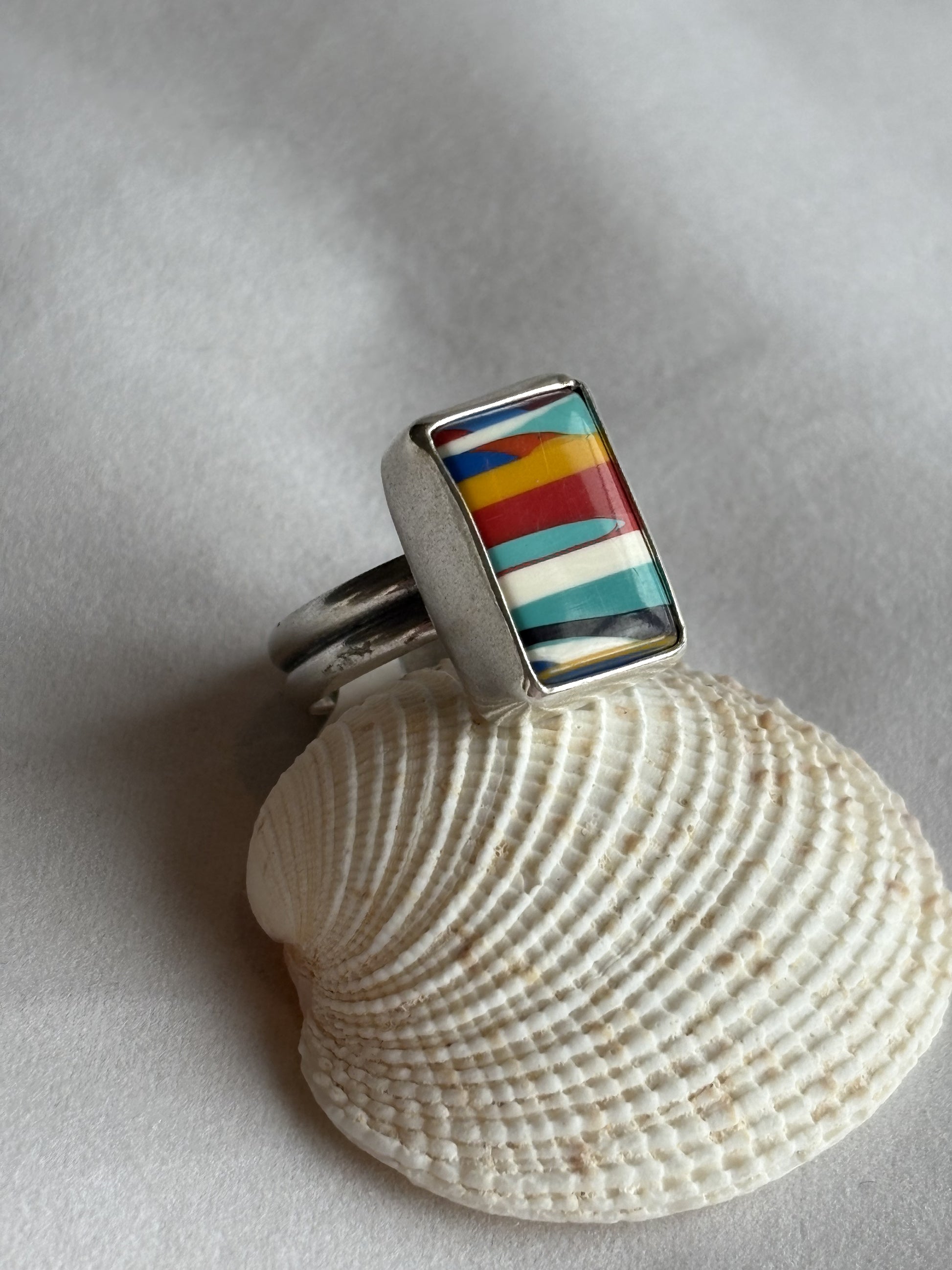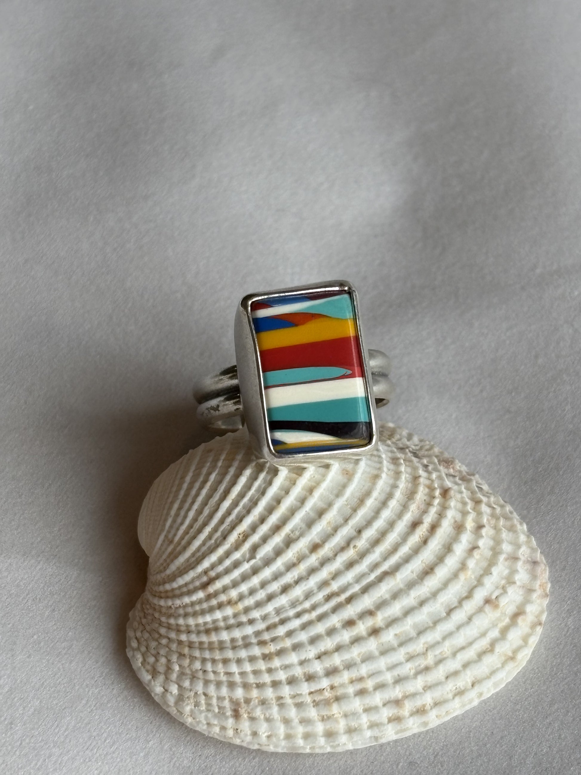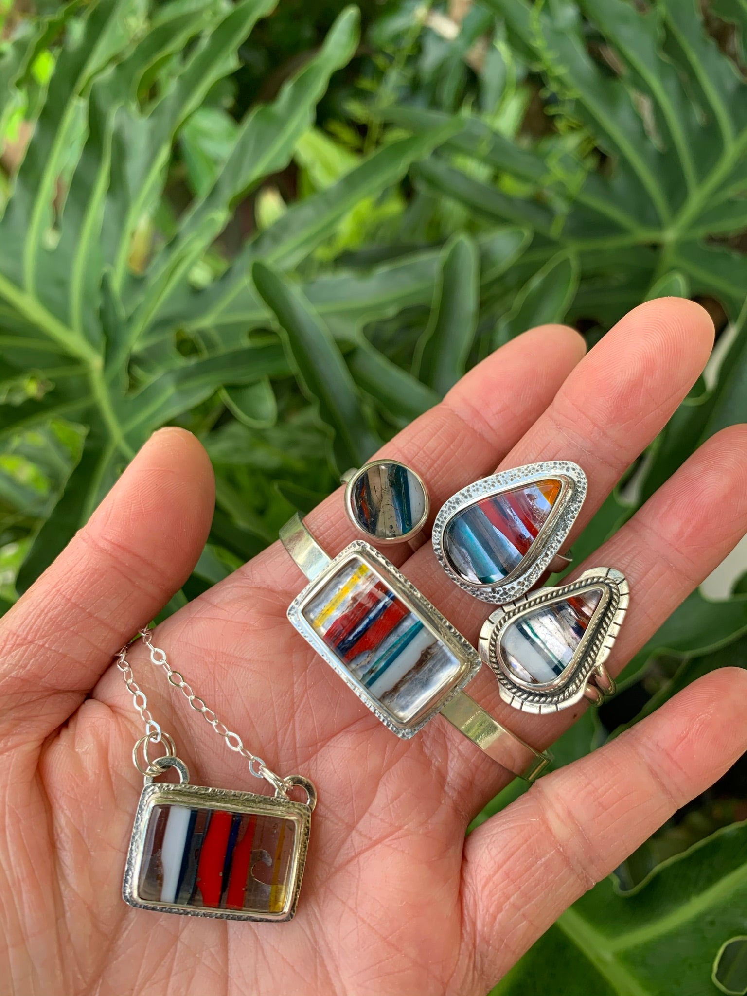 Hand-cut and polished repurposed surfboard resin material (surfite) set in silver.