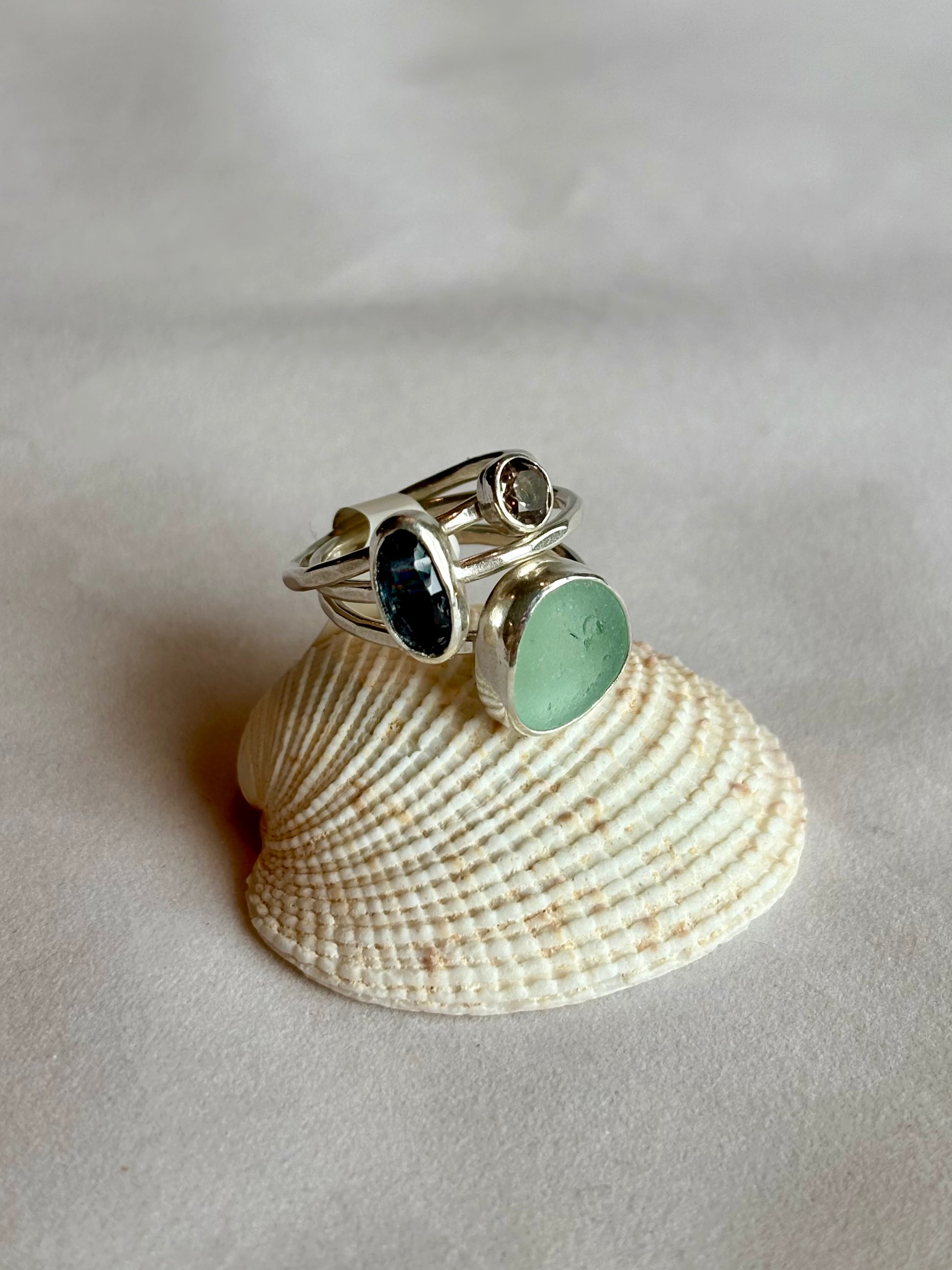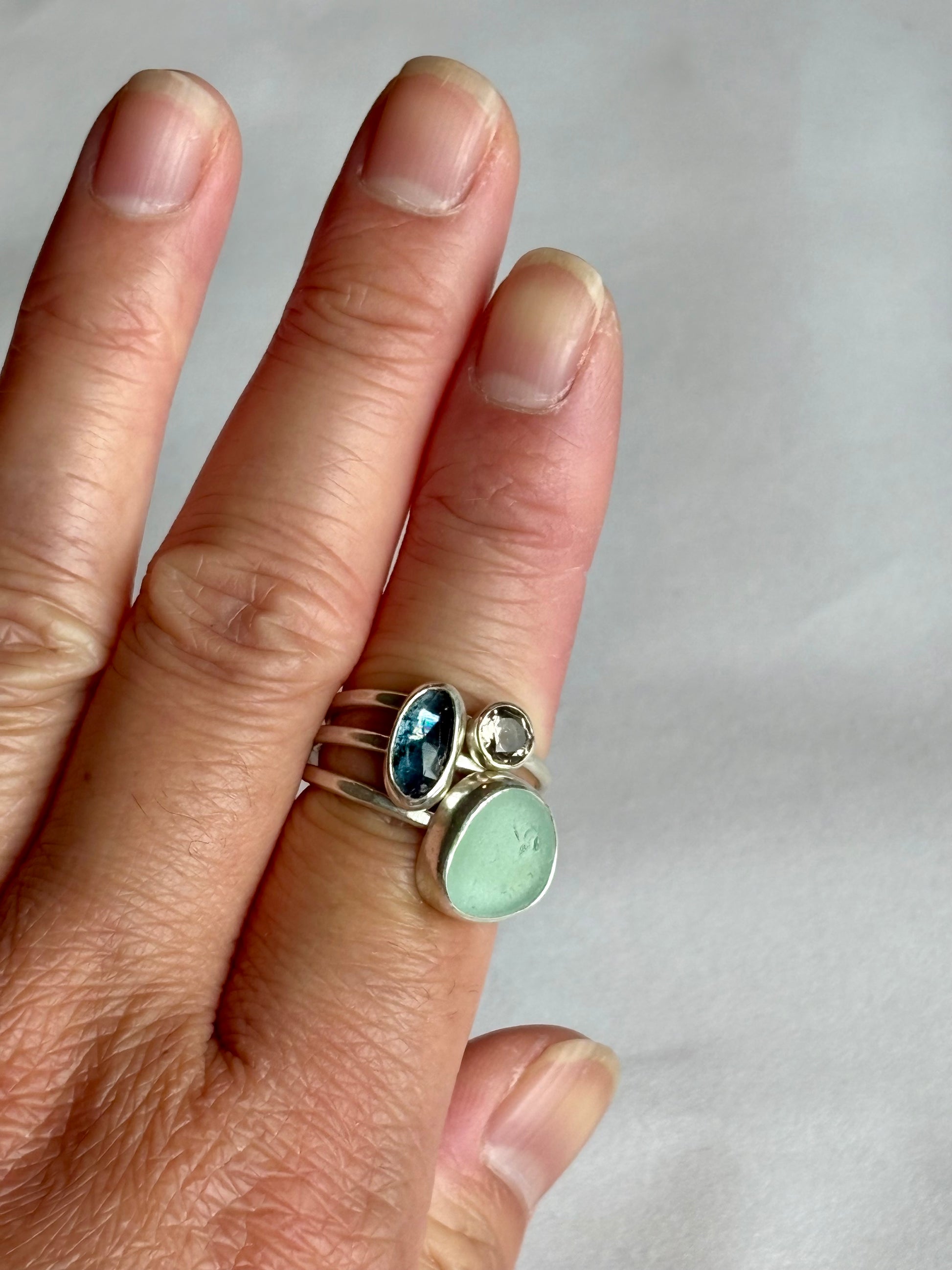 Stacked hammered rings with sea foam sea glass, teal moss kyanite gem and grey gemstone.